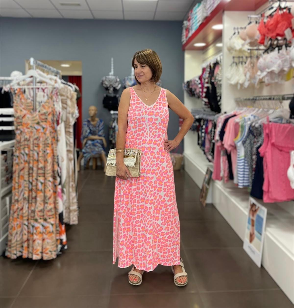 Femenino, cómodo y con mucho estilo. Este vestido largo en tonos rosas y corales con estampado tipo animal print es perfecto para brillar en los días de calor sin renunciar a la frescura.