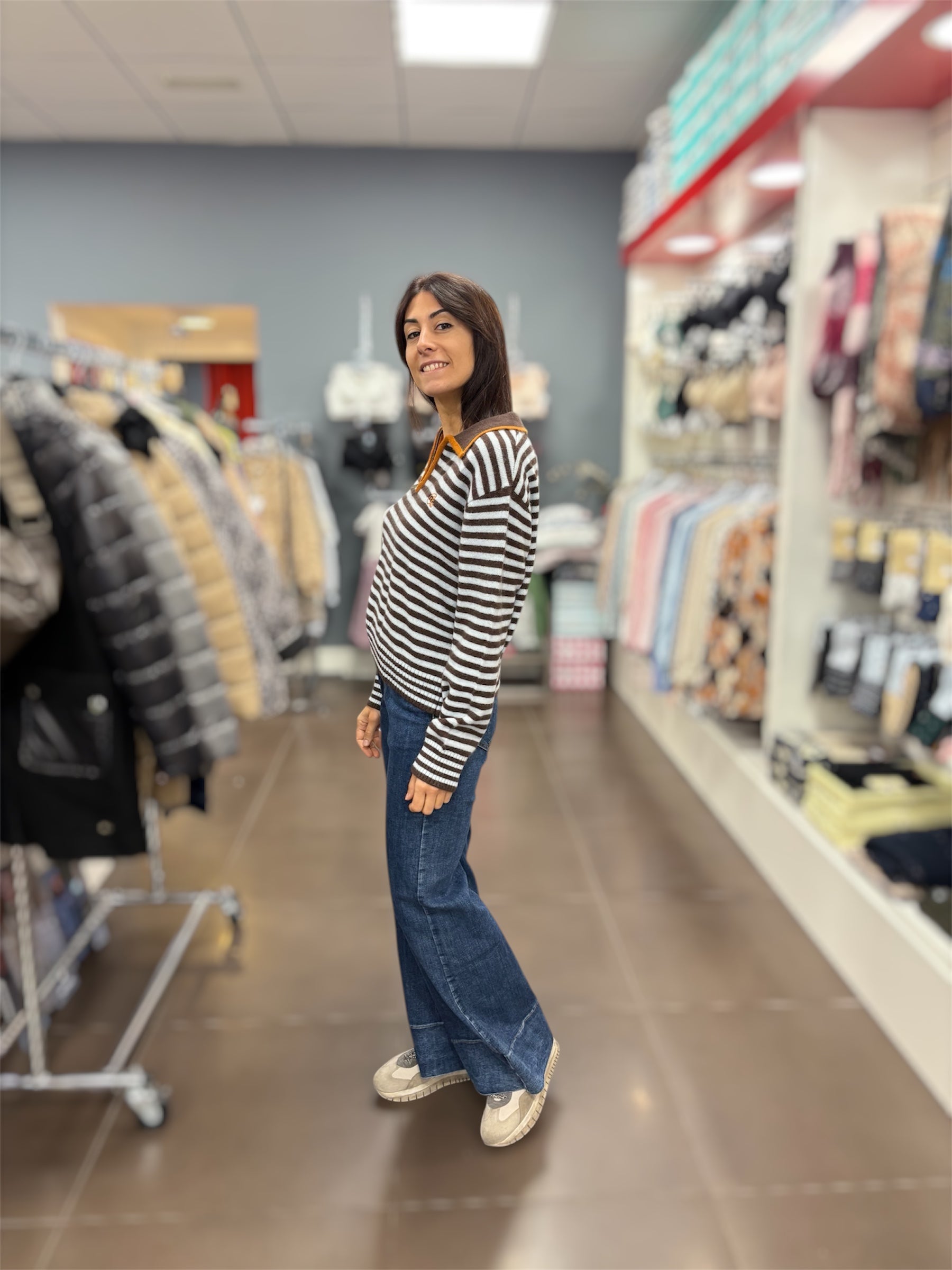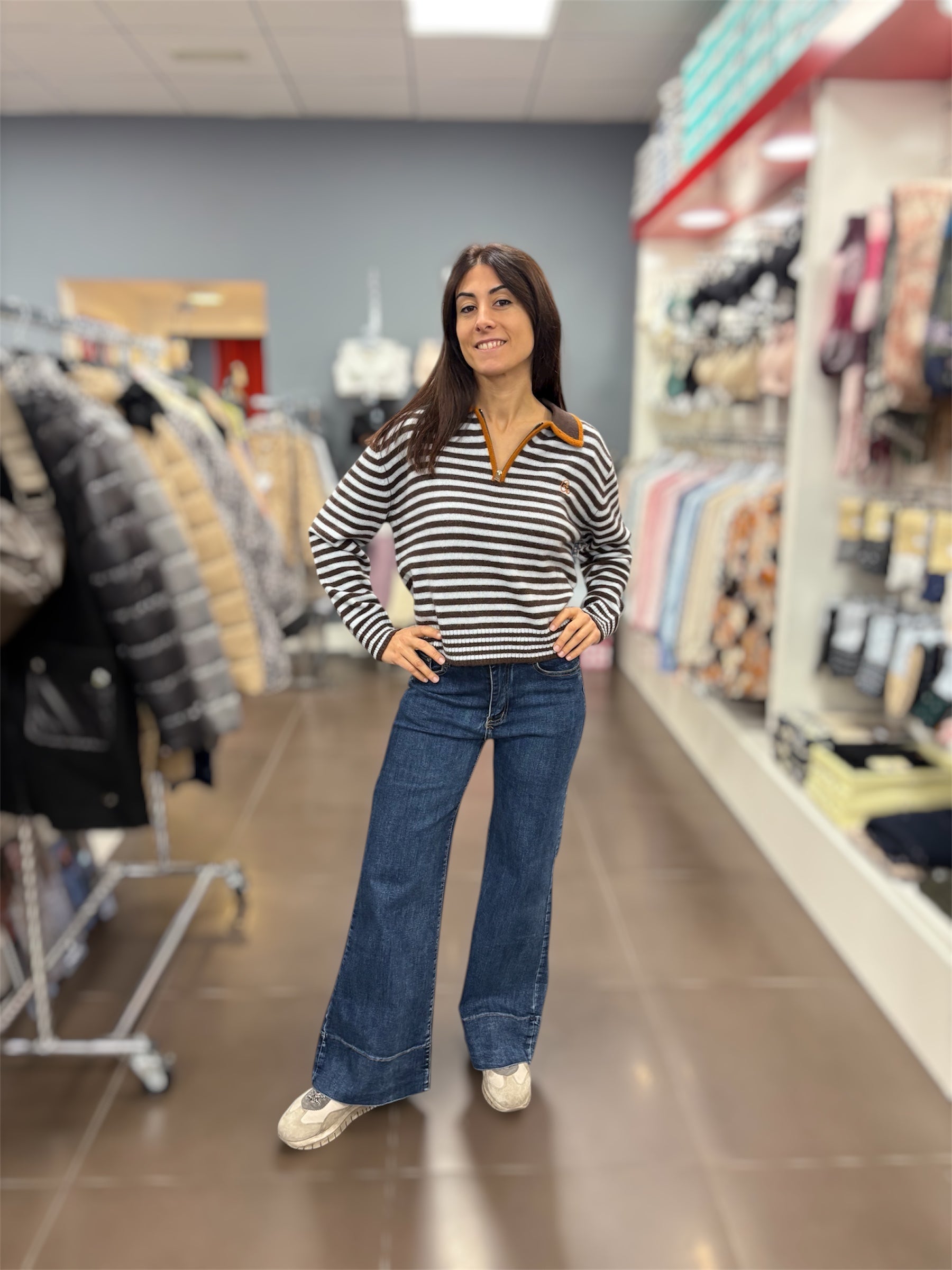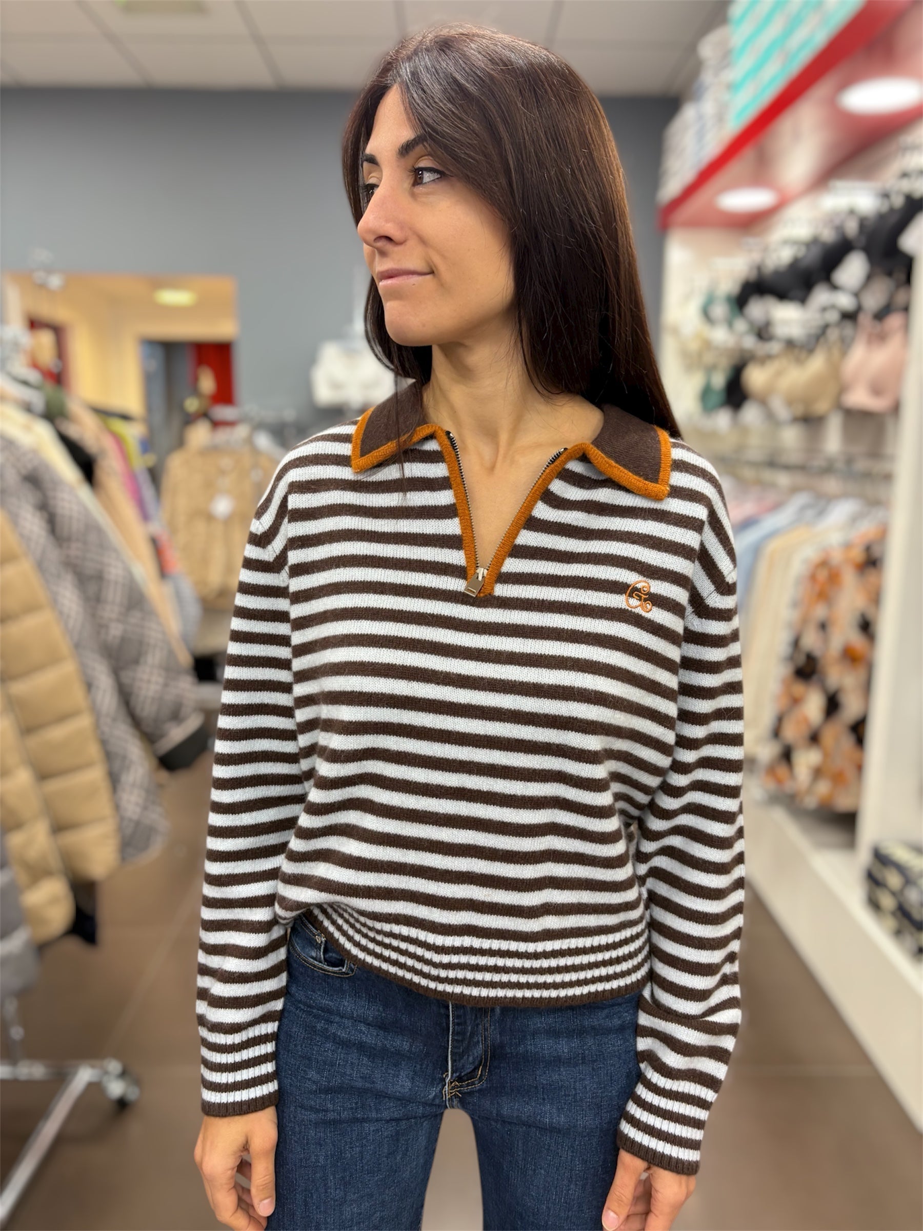 Un clásico que nunca falla, con un toque moderno y actual. Este jersey combina rayas en tonos marrón y blanco con detalles en color teja en el cuello, aportando calidez y estilo. El cierre de media cremallera y el cuello tipo polo lo hacen perfecto para tus looks casuales del día a día.