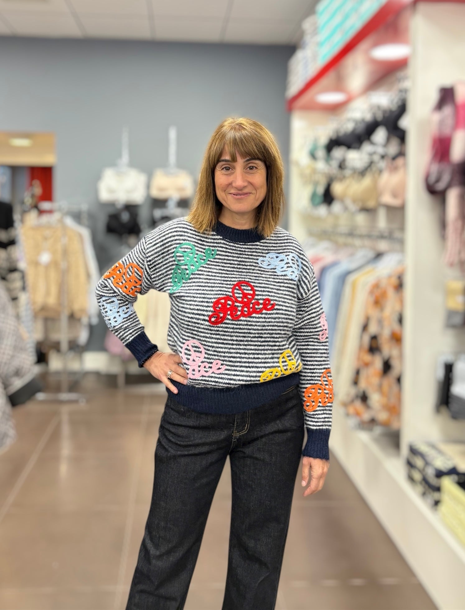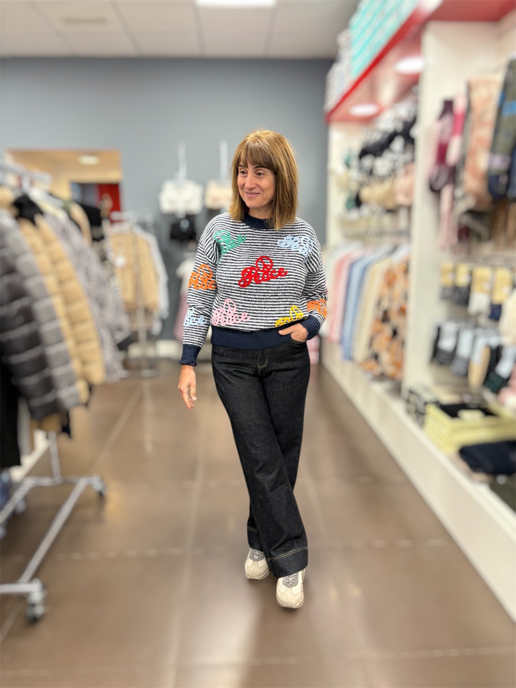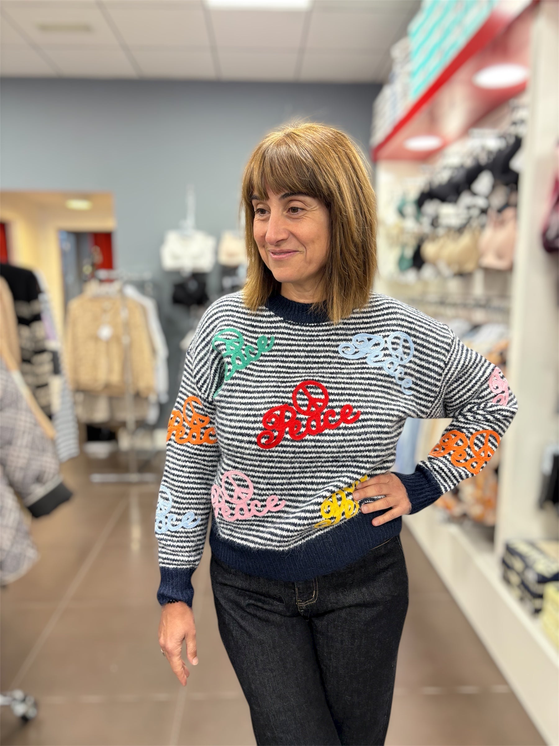 Un clásico renovado con un toque alegre y lleno de energía. Este jersey combina rayas marino y blanco con bordados coloridos Peace & Love, aportando frescura y estilo a tus looks de otoño e invierno. Su tejido suave, cálido y ligero lo convierte en una prenda ideal para el día a día.